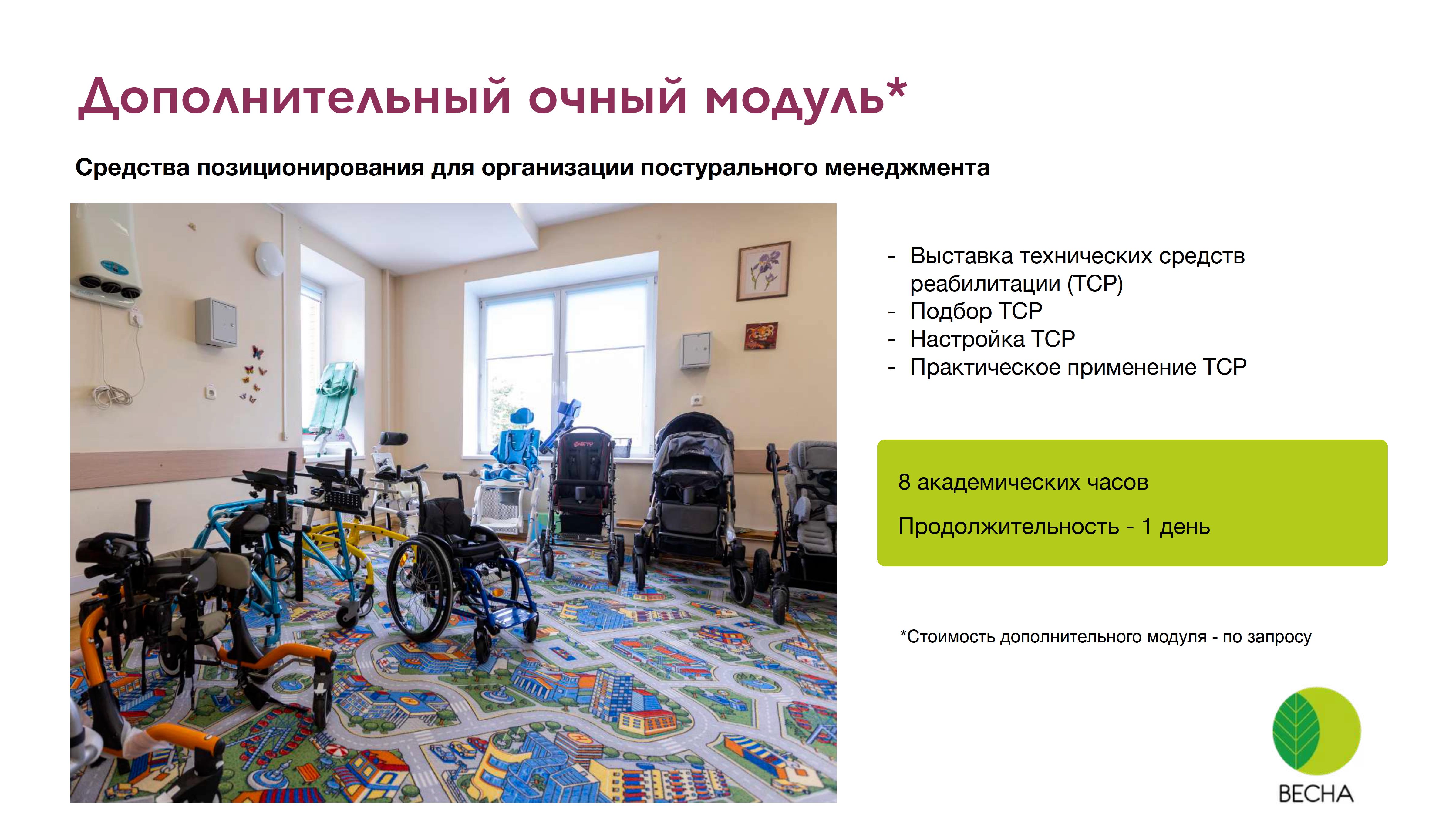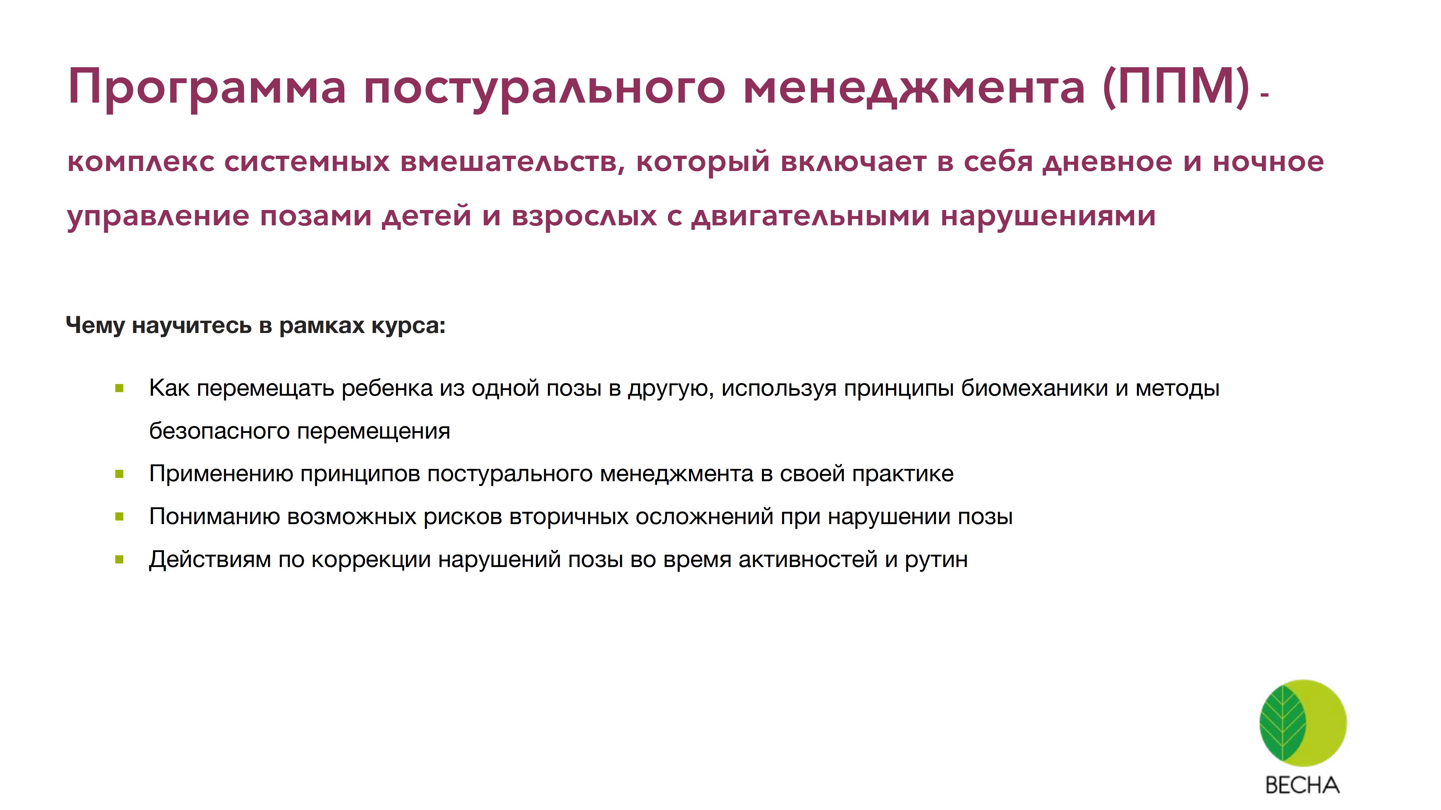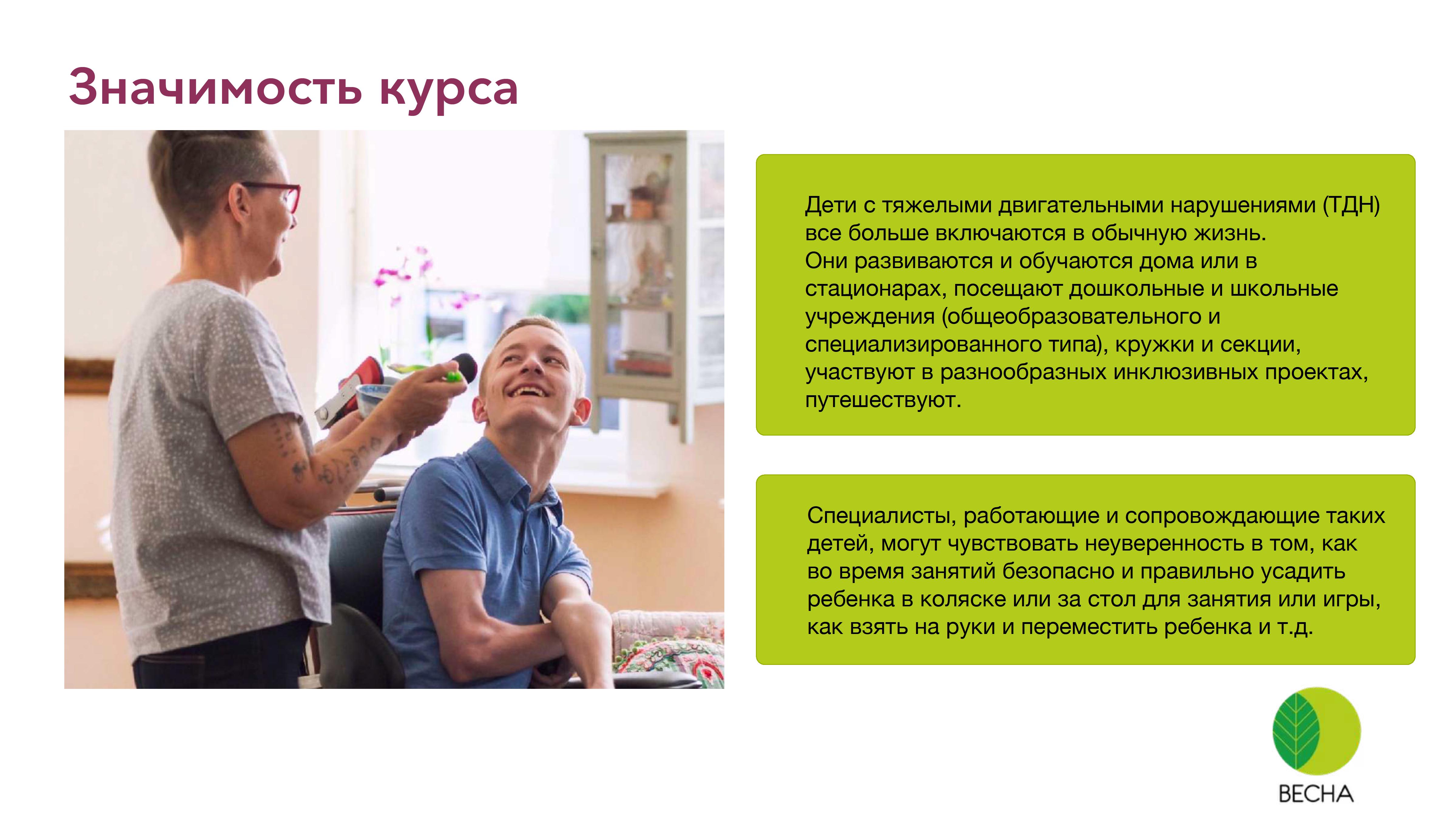 Благотворительный фонд "Весна" более 7 лет системно развивает функциональную реабилитацию в России, помогая детям и взрослым с двигательными нарушениями становиться более самостоятельными и независимыми. Одной из ключевых задач Фонда является обучение региональных специалистов постуральному менеджементу (уходу) — это использование правильного оборудования и техник позиционирования, которые помогают защитить и восстановить форму тела.