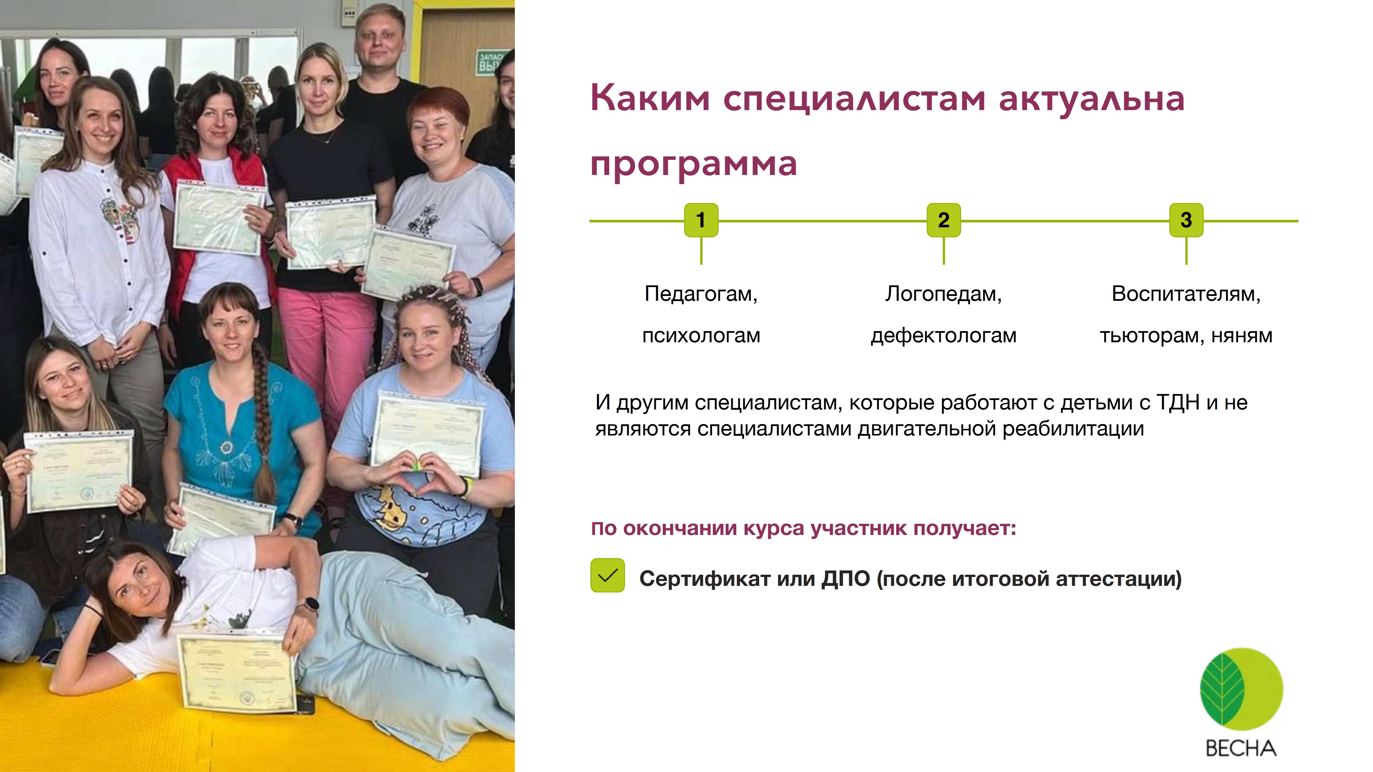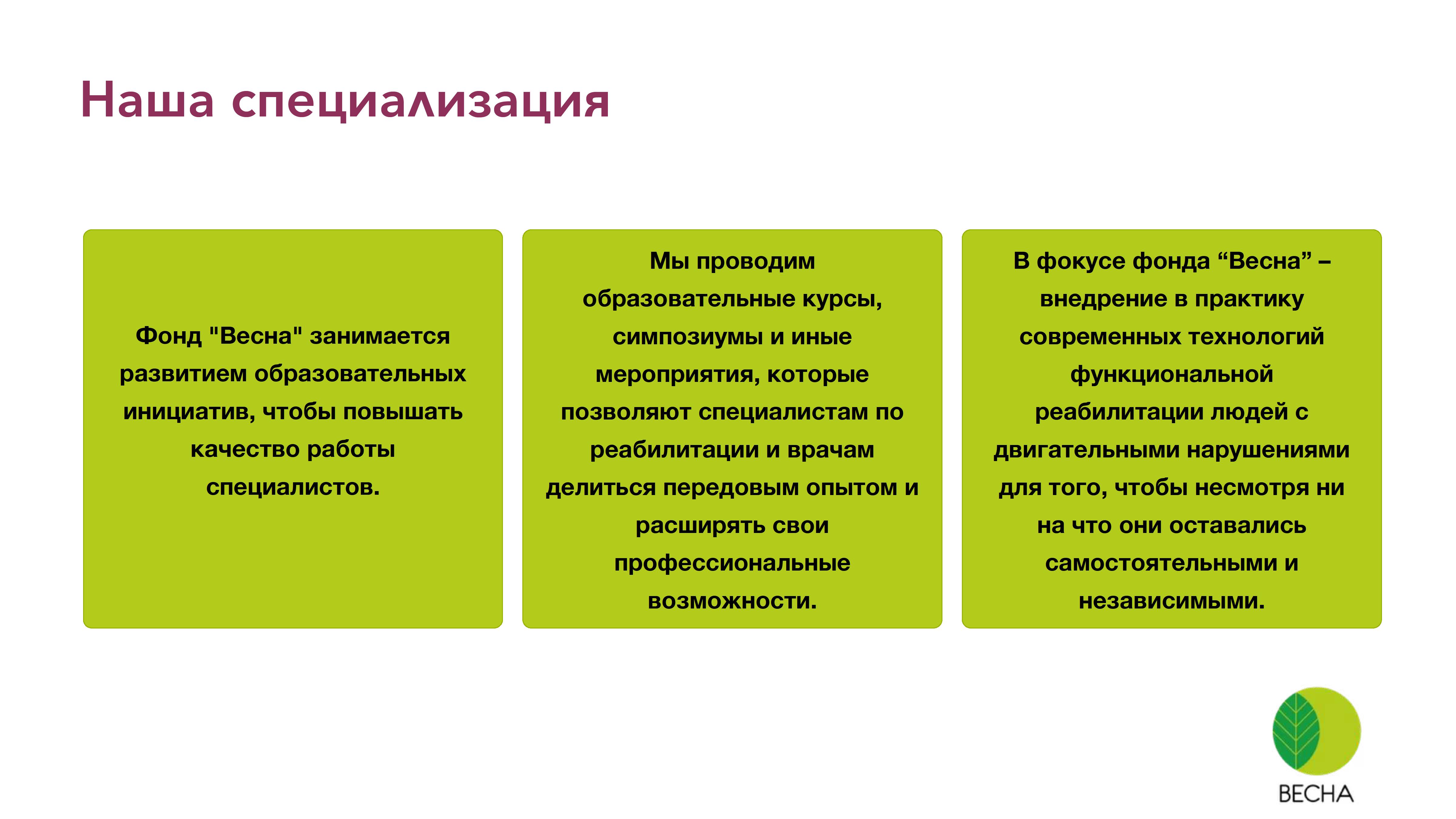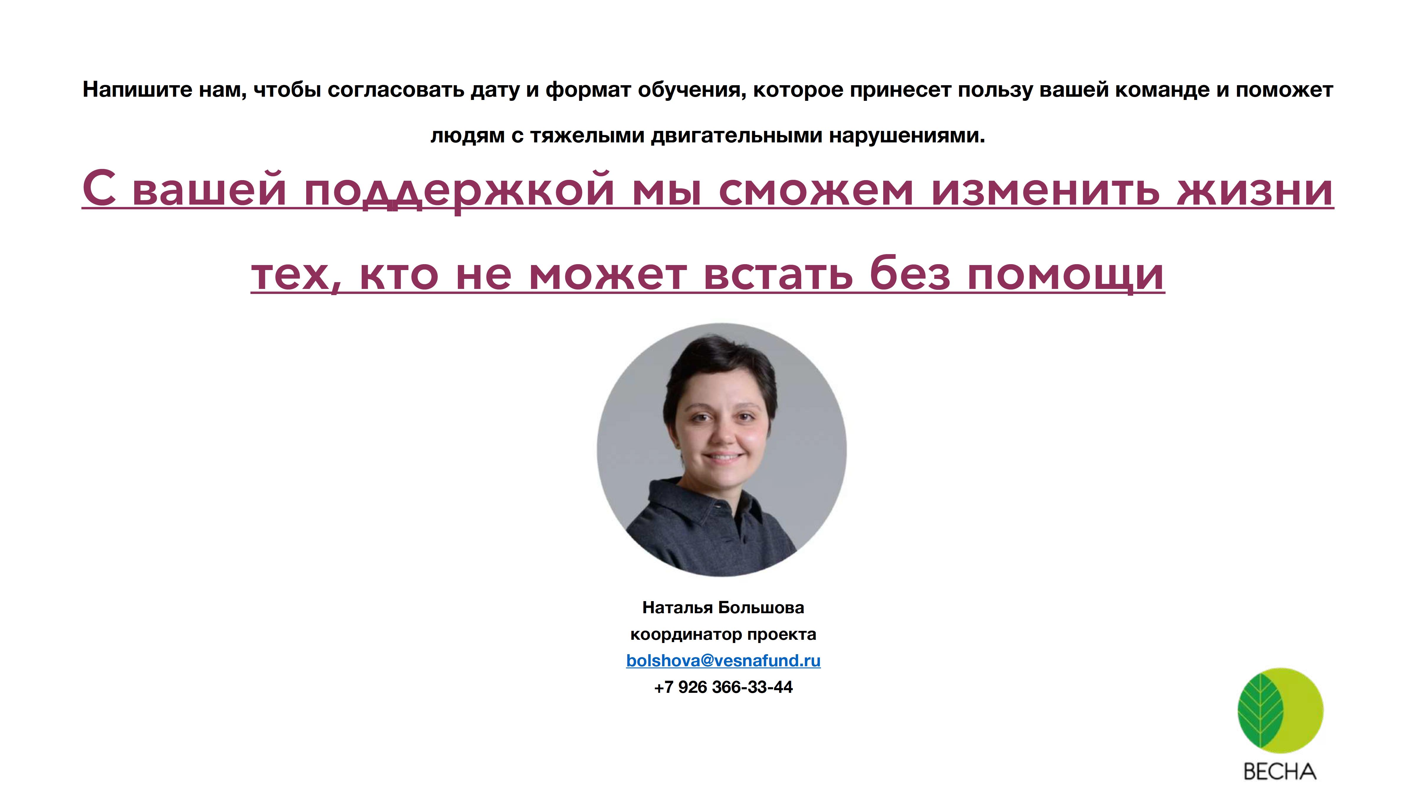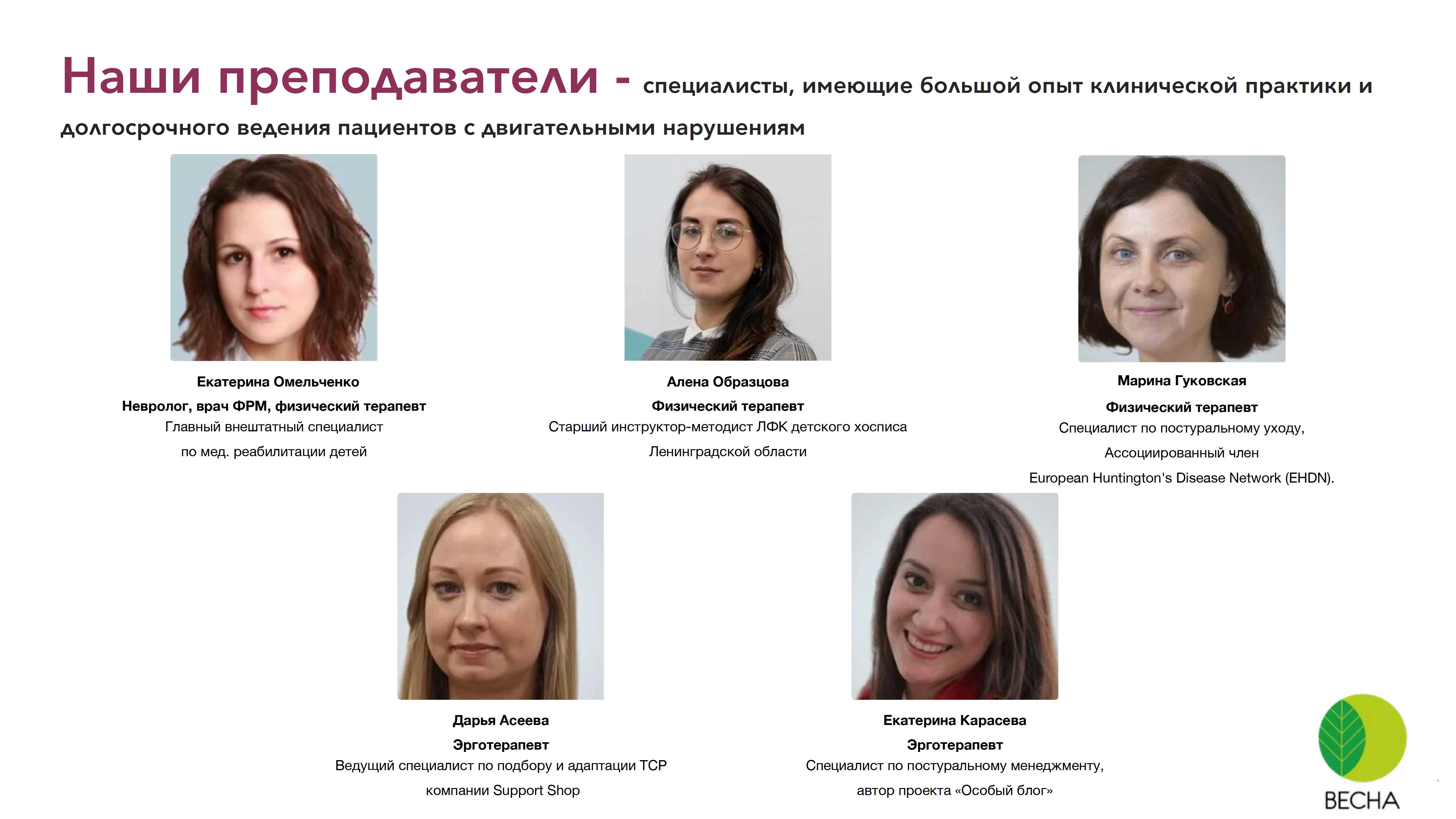 Благотворительный фонд "Весна" более 7 лет системно развивает функциональную реабилитацию в России, помогая детям и взрослым с двигательными нарушениями становиться более самостоятельными и независимыми. Одной из ключевых задач Фонда является обучение региональных специалистов постуральному менеджементу (уходу) — это использование правильного оборудования и техник позиционирования, которые помогают защитить и восстановить форму тела.